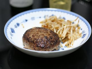 岩手のボンズというところの前沢牛ハンバーグ。フライパンに油をひかなくても肉汁だけで焼く。片面2分、ひっくり返してふたして6~7分でできあがり。うまっ。ハンバーグ好きにはたまらないです。勢いでワインもあけちゃいましたー。