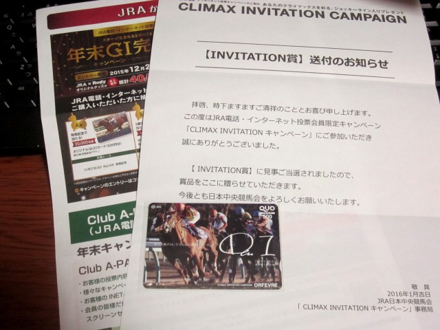 有馬記念は当たらなくても 日記 Twitter Facebook はてブ LINE コピー 2016.01.31 オルフェーブルのQUOカードが当たりました。思えば、昨年は1レースも競馬は当たりませんでした。恐るべし厄年。