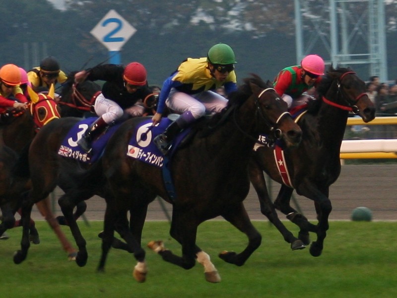 ↓最後の直線でのディープインパクト(ゼッケン6番で緑の帽子)、クリックするとでっかくなるよ