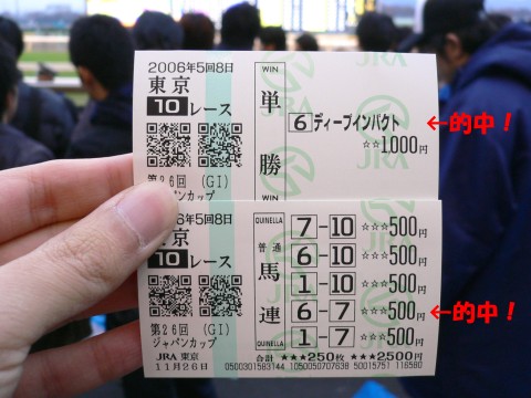 僕は前から応援しているコスモバルクとドリームパスポートを本命と対抗にしてました。ディープの単勝は記念馬券のつもり。ハーツクライはこのまま引退してしまうのかなー。