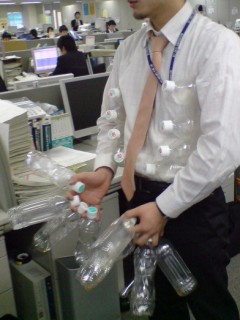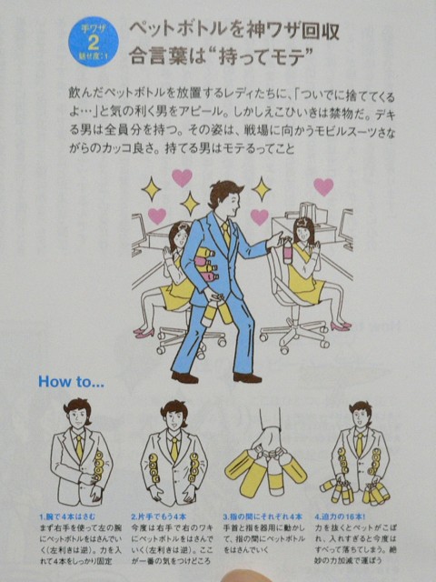 モテ”手ワザ”で持ってモテ 日記 Twitter Facebook はてブ LINE コピー 2007.03.13 R25にこんな記事が。「アナログな仕草で男を上げるモテ”手ワザ”」 その中の1つに「ペットボトルを神ワザ回収」を実践してみた。 飲んだペットボトルを放置するレディたちに、「ついでに捨ててくるよ・・・」と気の利く男をアピール。しかしえこひいきは禁物だ。デキる男は全員分を持つ。 右腕で4本、左腕で4本はさみ、右手の指の間に4本、左手に4本、で迫力の合計16本持ち。 持てる男はモテるってこと。 モデル協力:バッチョさん