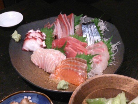 仕事はじめでーす。刺身盛り、うまそー。いただきまーす。
